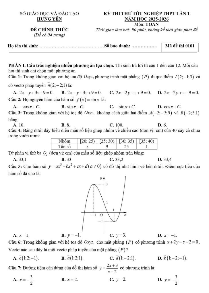 Đề thi thử Toán THPT 2026 – Sở GDĐT Hưng Yên (Lần 1)