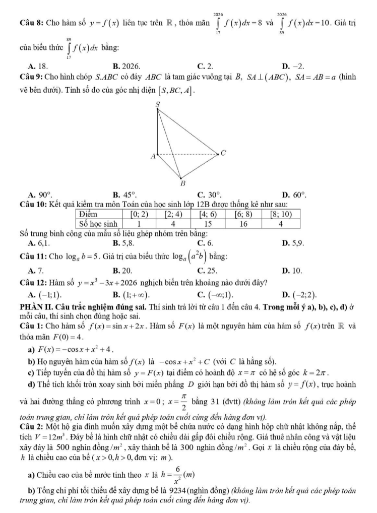Câu 8: Cho hàm số y = f(x) liên tục trên R, thỏa mãn tích phân từ 17 đến 2026 của f(x)dx = 8 và tích phân từ 89 đến 2026 của f(x)dx = 10. Giá trị của biểu thức tích phân từ 17 đến 89 của f(x)dx bằng:
