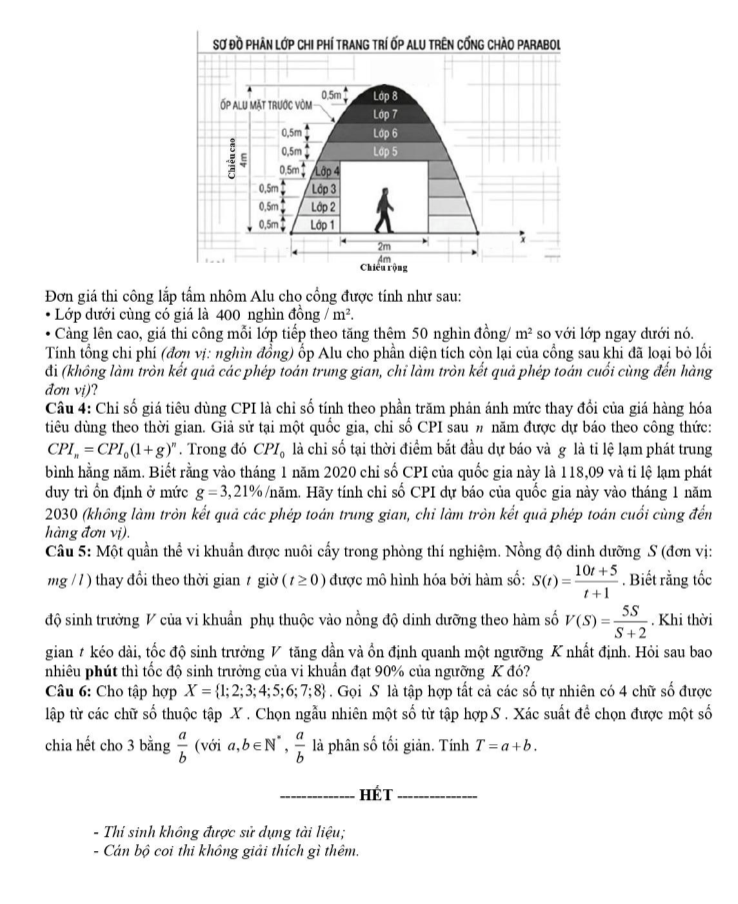 Câu 3: Để chuẩn bị cho lễ hội, một đơn vị thi công dựng một cổng chào dạng vòm Parabol có chiều cao 4 m và chiều rộng chân cổng là 4 m. Ở chính giữa cổng, người ta thiết kế một lối đi hình chữ nhật cao 2 m và rộng 2 m. Phần diện tích mặt trước của cổng Parabol (sau khi đã trừ lối đi hình chữ nhật) được chia thành 8 lớp ngang, mỗi lớp cao 0,5m để ốp tấm nhôm Alu trang trí có màu khác nhau (như bản vẽ thiết kế hình bên dưới).