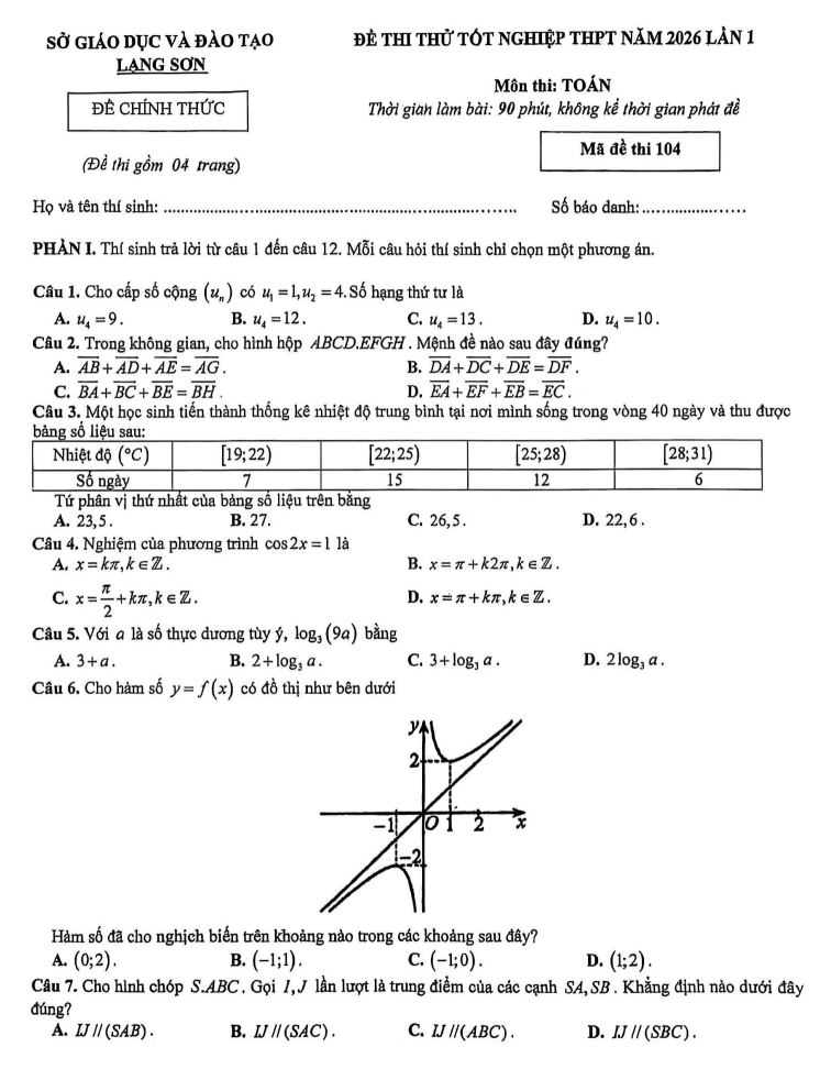 Đề thi thử Toán THPT 2026 – Sở GDĐT Lạng Sơn (Lần 1) là nguồn tài liệu ôn luyện thiết thực dành cho học sinh lớp 12 trong năm học 2025–2026, đặc biệt hữu ích ở giai đoạn củng cố kiến thức và chuẩn bị cho kỳ thi tốt nghiệp THPT. Việc tiếp cận đề thi này giúp người học tự đánh giá năng lực, rà soát những phần kiến thức còn chưa chắc và điều chỉnh kế hoạch ôn tập theo hướng hiệu quả hơn. Với học sinh đang cần đề luyện tốt nghiệp THPT môn Toán, đây là tài liệu phù hợp để làm quen với nhiều chuyên đề trọng tâm như hàm số, mũ và logarit, nguyên hàm – tích phân, số phức, hình học không gian, xác suất và các bài toán vận dụng. Bên cạnh vai trò ôn tập nền tảng, đề còn hỗ trợ rèn kỹ năng suy luận, tăng tốc độ xử lý câu hỏi và cải thiện độ chính xác khi làm bài, vì vậy cũng có thể tham khảo như một dạng đề trắc nghiệm thi Đại học trong quá trình luyện đề nâng cao.
