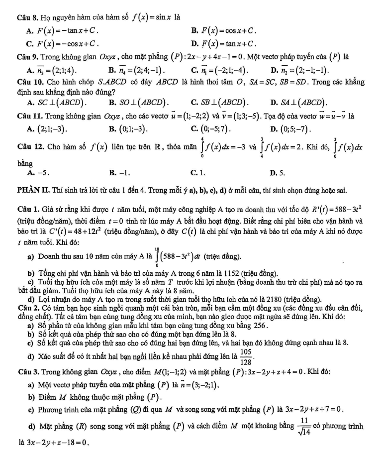 Câu 1. Giả sử rằng khi được t năm tuổi, một máy công nghiệp A tạo ra doanh thu với tốc độ R'(t) = 588 – 3t^2 (triệu đồng/năm), thời điểm t = 0 tính từ lúc máy A bắt đầu hoạt động. Biết rằng chi phí bảo trì và vận hành máy A là C'(t) = 48 + 12t^2 (triệu đồng/năm), ở đây C(t) là chi phí vận hành và bảo trì của máy A khi nó được t năm tuổi. Khi đó: