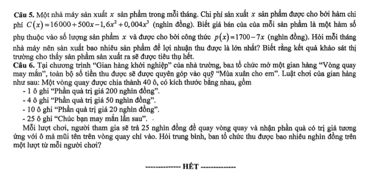 Câu 5. Một nhà máy sản xuất x sản phẩm trong mỗi tháng. Chi phí sản xuất x sản phẩm được cho bởi hàm chi phí C(x) = 16000 + 500x – 1,6x^2 + 0,004x^3 (nghìn đồng). Biết giá bán của mỗi sản phẩm là một hàm số phụ thuộc vào số lượng sản phẩm x và được cho bởi công thức p(x) = 1700 – 7x (nghìn đồng). Hỏi mỗi tháng nhà máy nên sản xuất bao nhiêu sản phẩm để lợi nhuận thu được là lớn nhất? Biết rằng kết quả khảo sát thị trường cho thấy sản phẩm sản xuất ra sẽ được tiêu thụ hết.