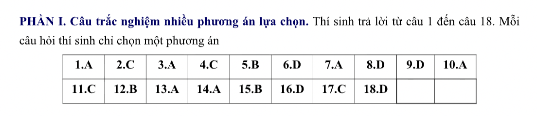 PHẦN I. Câu trắc nghiệm nhiều phương án lựa chọn. Thì sinh trả lời tới câu 1 đến câu 18. Mỗi câu hỏi thì sinh chỉ chọn một phương án.