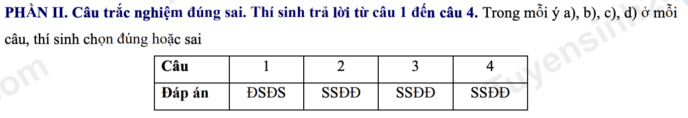PHẦN II. Câu trắc nghiệm đúng sai. Thí sinh trả lời từ câu 1 đến câu 4. Trong mỗi ý a), b), c), d) ở mỗi câu, thi sinh chọn đúng hoặc sai