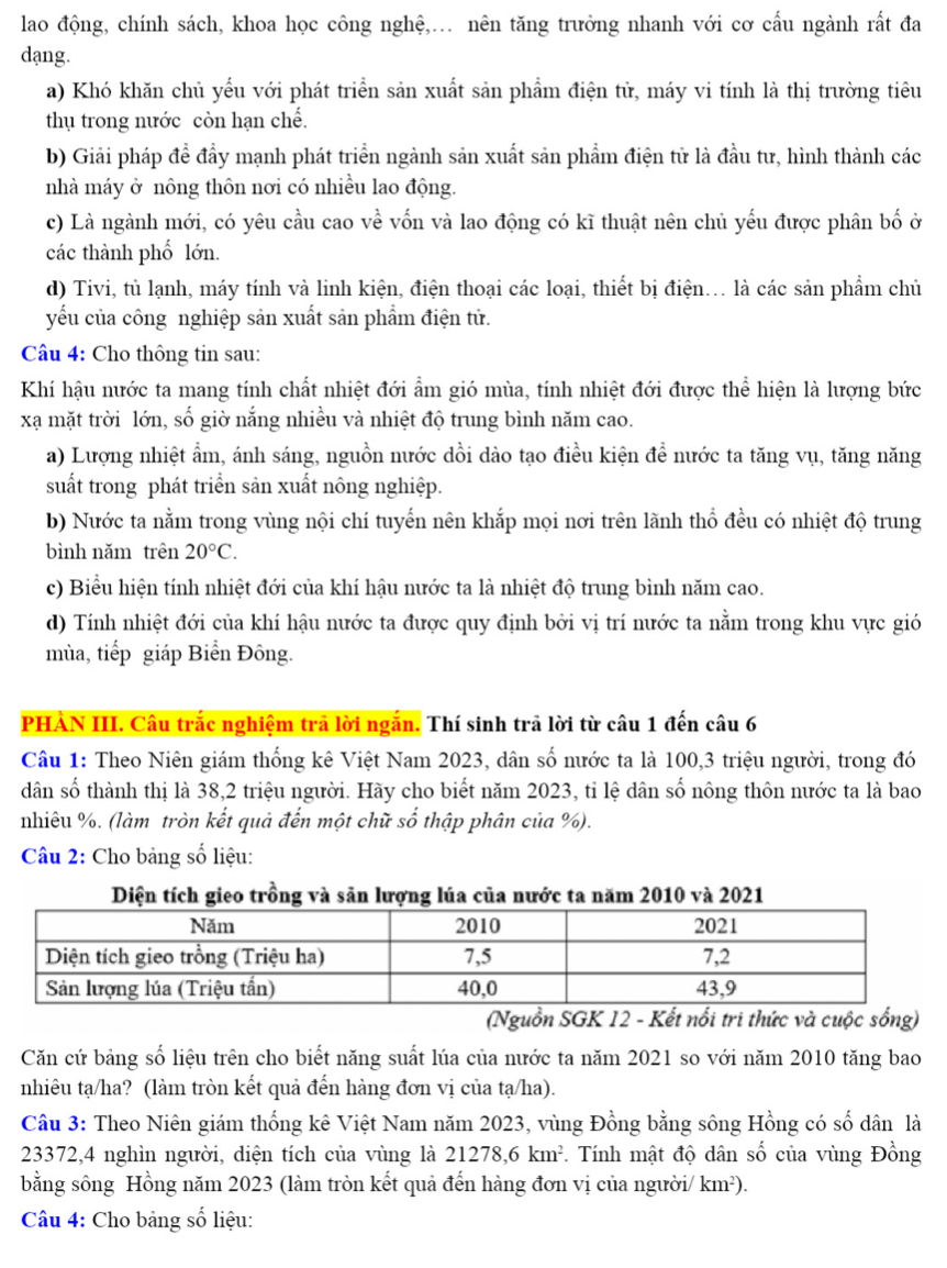 Câu 3: Theo Niên giám thống kê Việt Nam năm 2023, vùng Đồng bằng sông Hồng có số dân là 23372,4 nghìn người, diện tích của vùng là 21278,6 km². Tính mật độ dân số của vùng Đồng bằng sông Hồng năm 2023 (làm tròn kết quả đến hàng đơn vị của người/ km²).