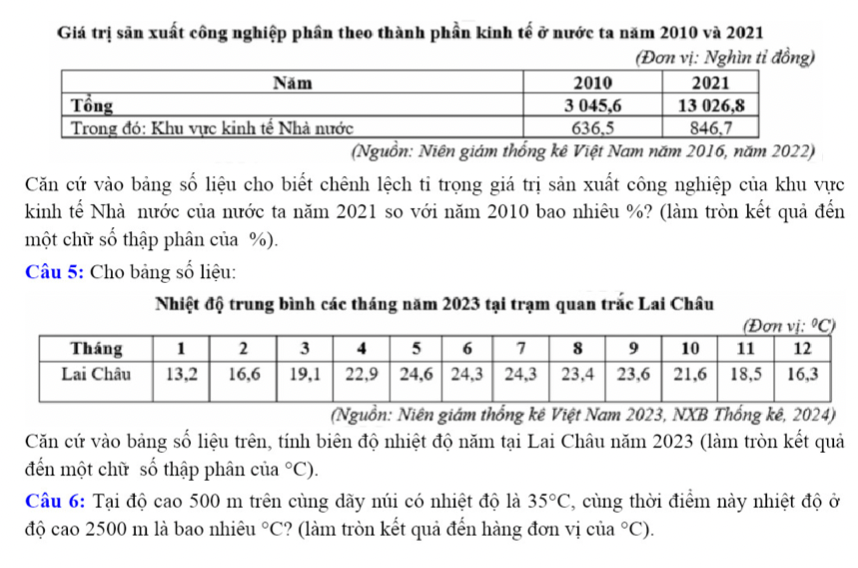 Căn cứ vào bảng số liệu trên, tính biên độ nhiệt độ năm tại Lai Châu năm 2023 (làm tròn kết quả đến một chữ số thập phân của ºC).