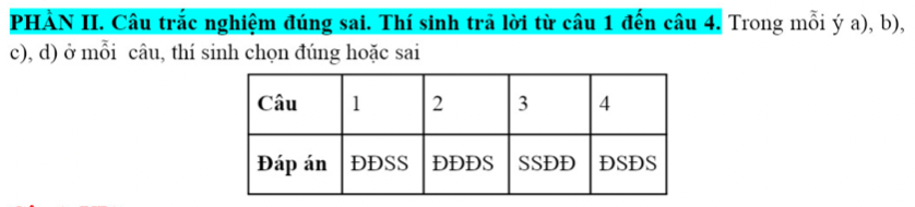 PHẦN II. Câu trắc nghiệm đúng sai. Thí sinh trả lời từ câu 1 đến câu 4. Trong mỗi ý a), b), c), d) ở mỗi câu, thí sinh chọn đúng hoặc sai