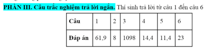 PHẦN III. Câu trắc nghiệm trả lời ngắn. Thí sinh trả lời từ câu 1 đến câu 6