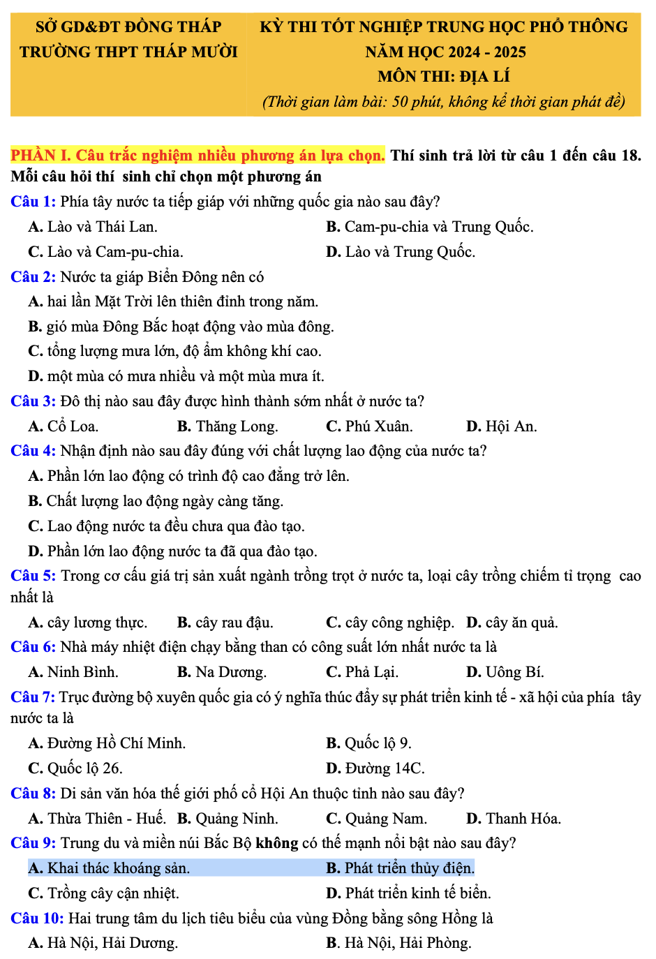 Đề thi thử tốt nghiệp THPT 2025 môn Địa Lí – Sở Đồng Tháp (THPT Tháp Mười)