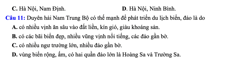 Câu 11: Duyên hải Nam Trung Bộ có thế mạnh để phát triển du lịch biển, đảo là do