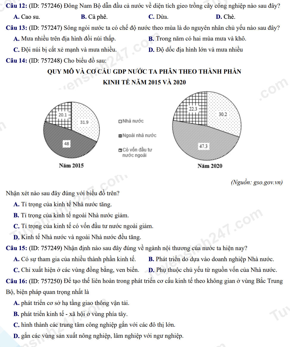 Thí sinh trả lời từ câu 1 đến câu 6.