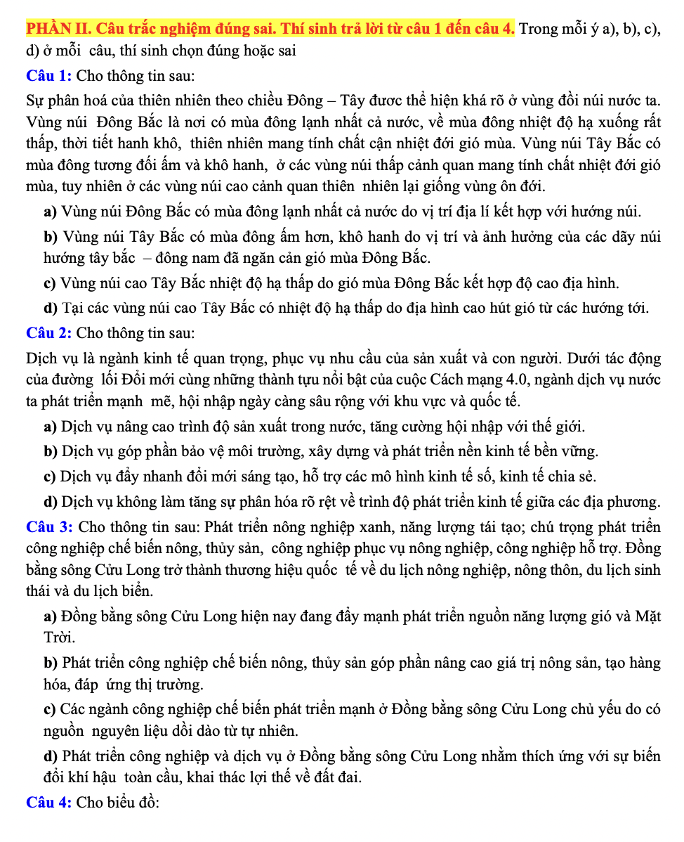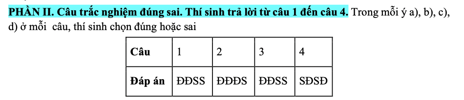Thí sinh trả lời từ câu 1 đến câu 4. Trong mỗi ý a), b), c), d) ở mỗi câu, thí sinh chọn đúng hoặc sai.
