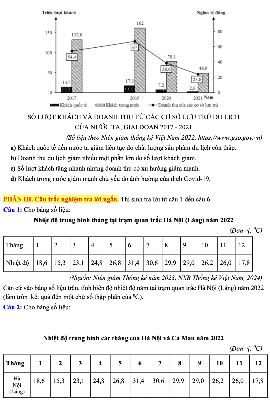 Căn cứ vào bảng số liệu trên, tính biên độ nhiệt độ năm tại trạm quan trắc Hà Nội (Láng) năm 2022 (làm tròn kết quả đến một chữ số thập phân của °C).