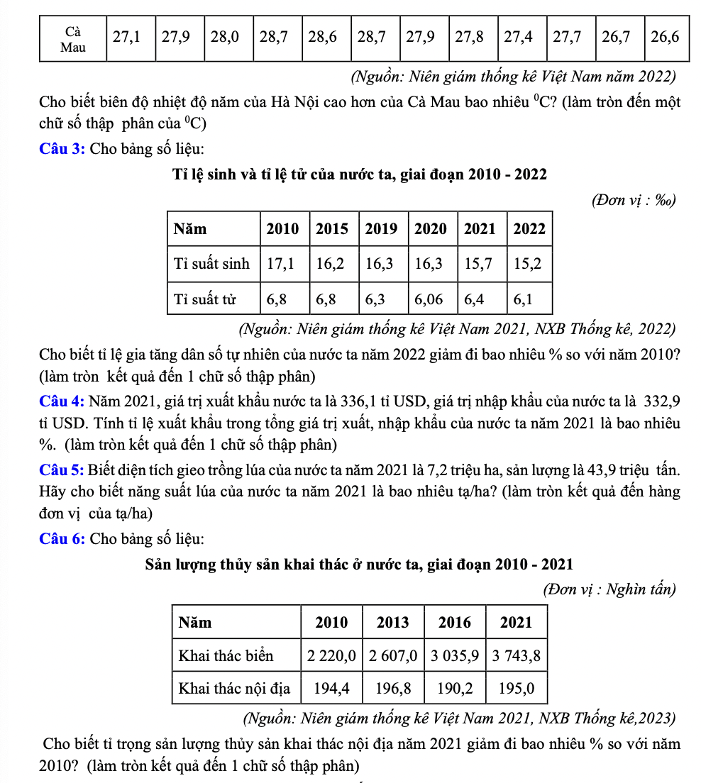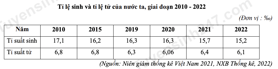 Câu 3: Cho bảng số liệu: Tỉ lệ sinh và tỉ lệ tử của nước ta, giai đoạn 2010 – 2022