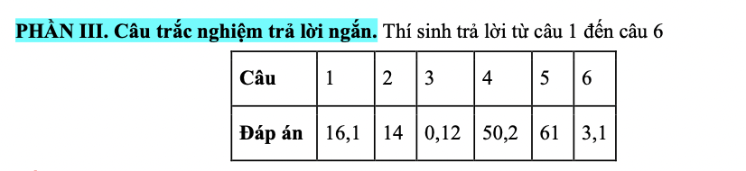 PHẦN III. Câu trắc nghiệm trả lời ngắn.