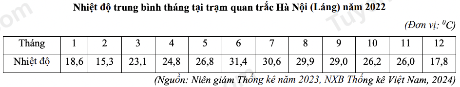 Câu 1: Cho bảng số liệu: Nhiệt độ trung bình tháng tại trạm quan trắc Hà Nội (Láng) năm 2022