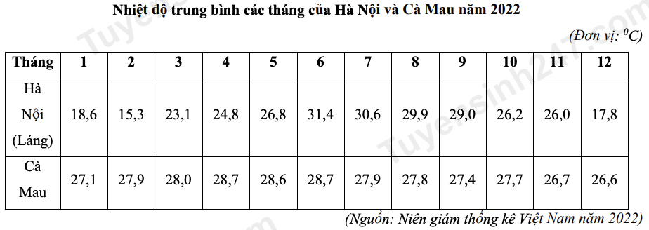 Câu 2: Cho bảng số liệu: Nhiệt độ trung bình các tháng của Hà Nội và Cà Mau năm 2022