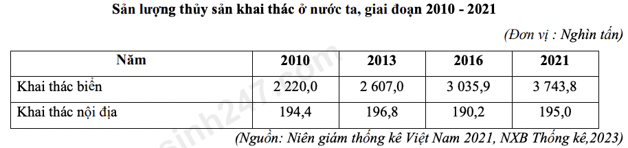Câu 6: Cho bảng số liệu: Sản lượng thủy sản khai thác ở nước ta, giai đoạn 2010 – 2021
