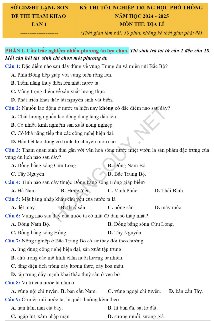 Đề thi thử tốt nghiệp THPT 2025 môn Địa Lí sở GDĐT Lạng Sơn – Lần 1