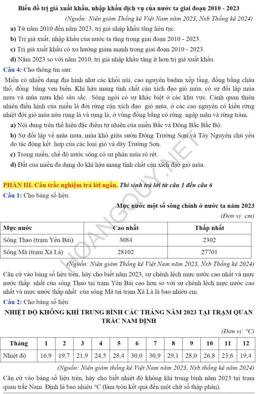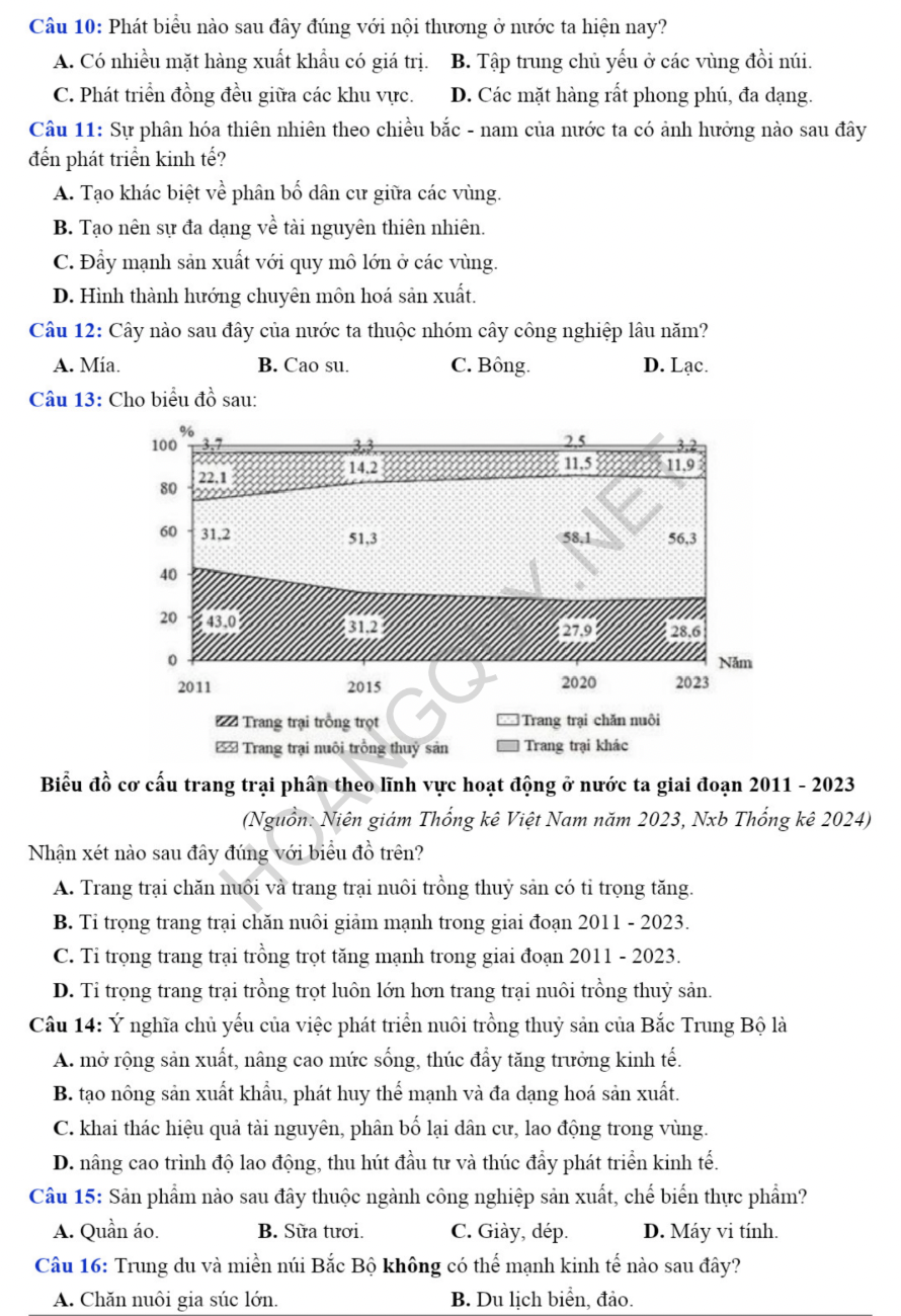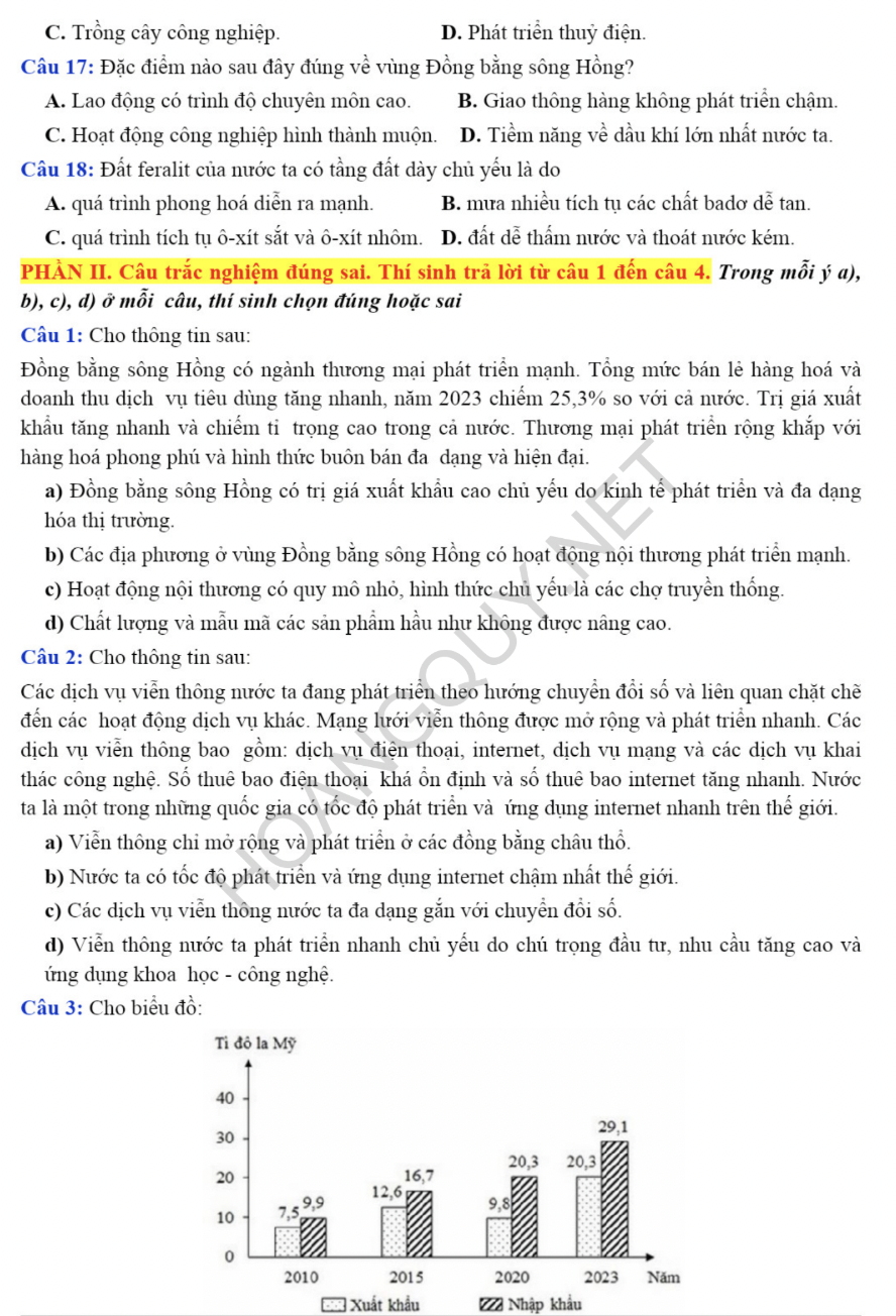 Nội dung đề thi bao phủ toàn diện chương trình Địa lí lớp 12 với các chuyên đề quan trọng như địa lí tự nhiên, dân cư, các ngành kinh tế trọng điểm, cùng các vấn đề chuyên sâu như chuyển dịch cơ cấu kinh tế, phân hóa lãnh thổ, phát triển vùng kinh tế, và đặc biệt là hệ thống câu hỏi luyện tập kỹ năng sử dụng Atlat Địa lí Việt Nam – phần không thể thiếu trong mọi đề thi trắc nghiệm chuẩn.