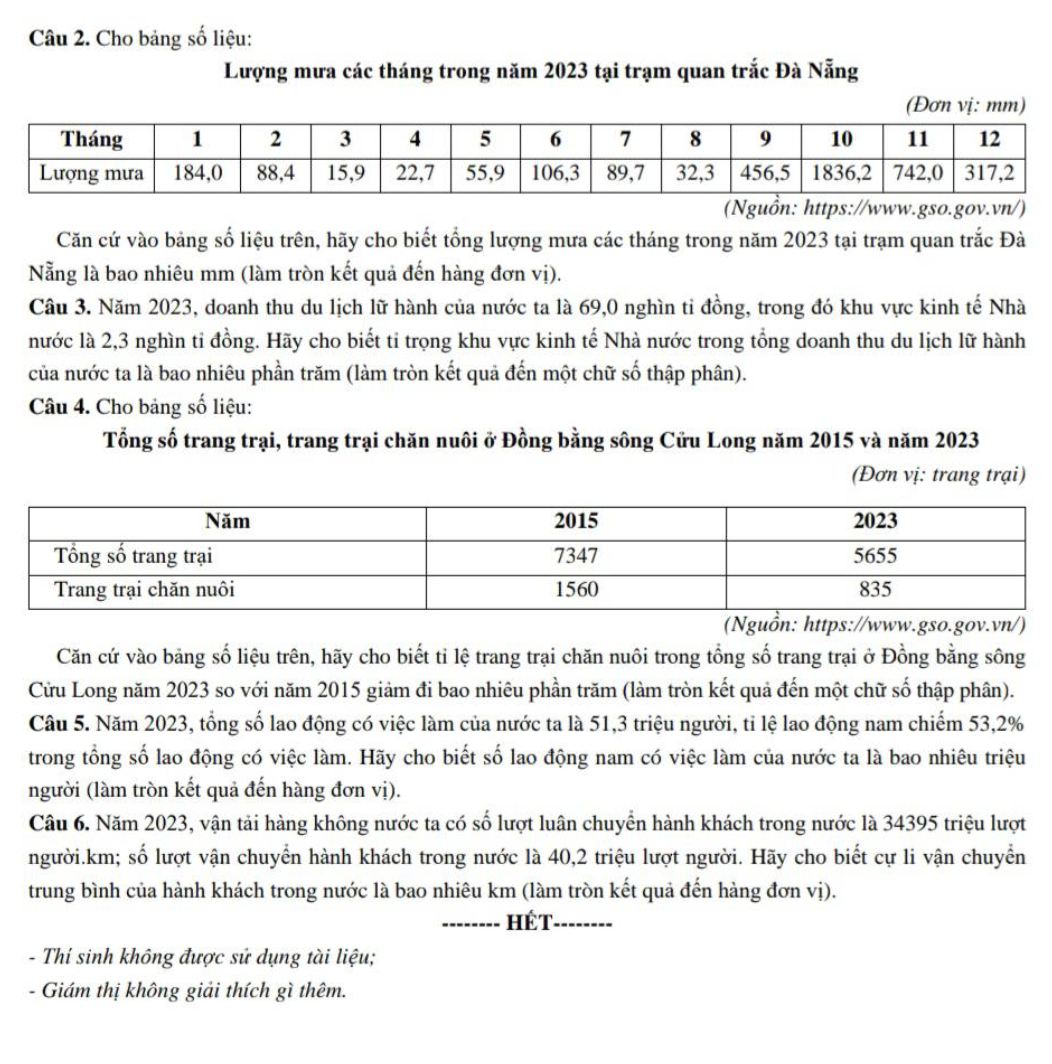 (Thí sinh trả lời từ câu 1 đến câu 6)