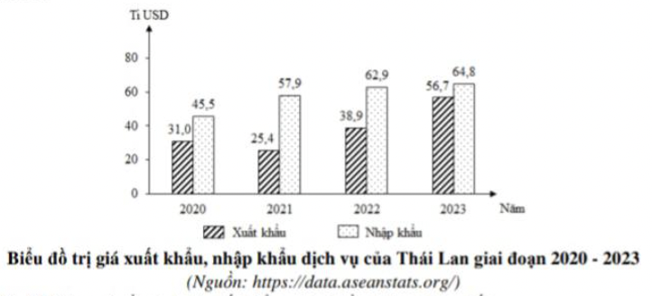 a) Năm 2023, Thái Lan có tổng trị giá xuất khẩu, nhập khẩu dịch vụ lớn nhất.