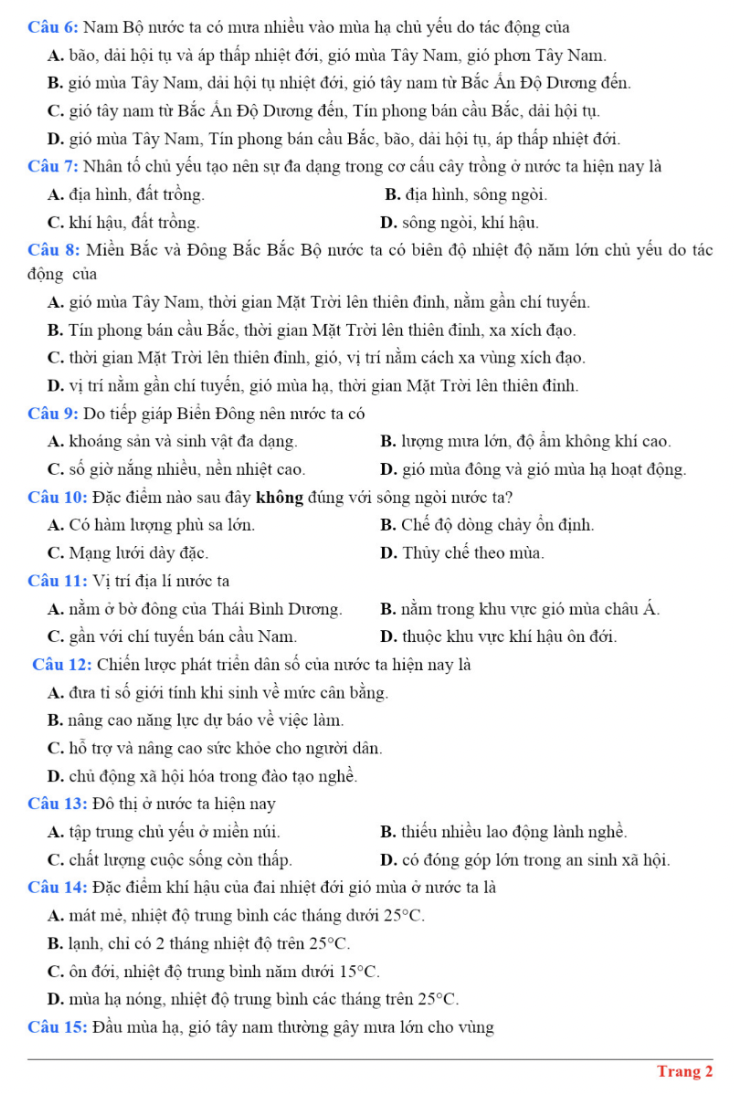 Câu 6: Nam Bộ nước ta có mưa nhiều vào mùa hạ chủ yếu do tác động của