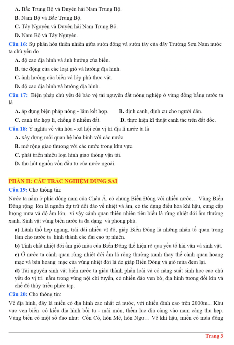 Câu 16: Sự phân hóa thiên nhiên giữa sườn đông và sườn tây của dãy Trường Sơn Nam nước ta chủ yếu do