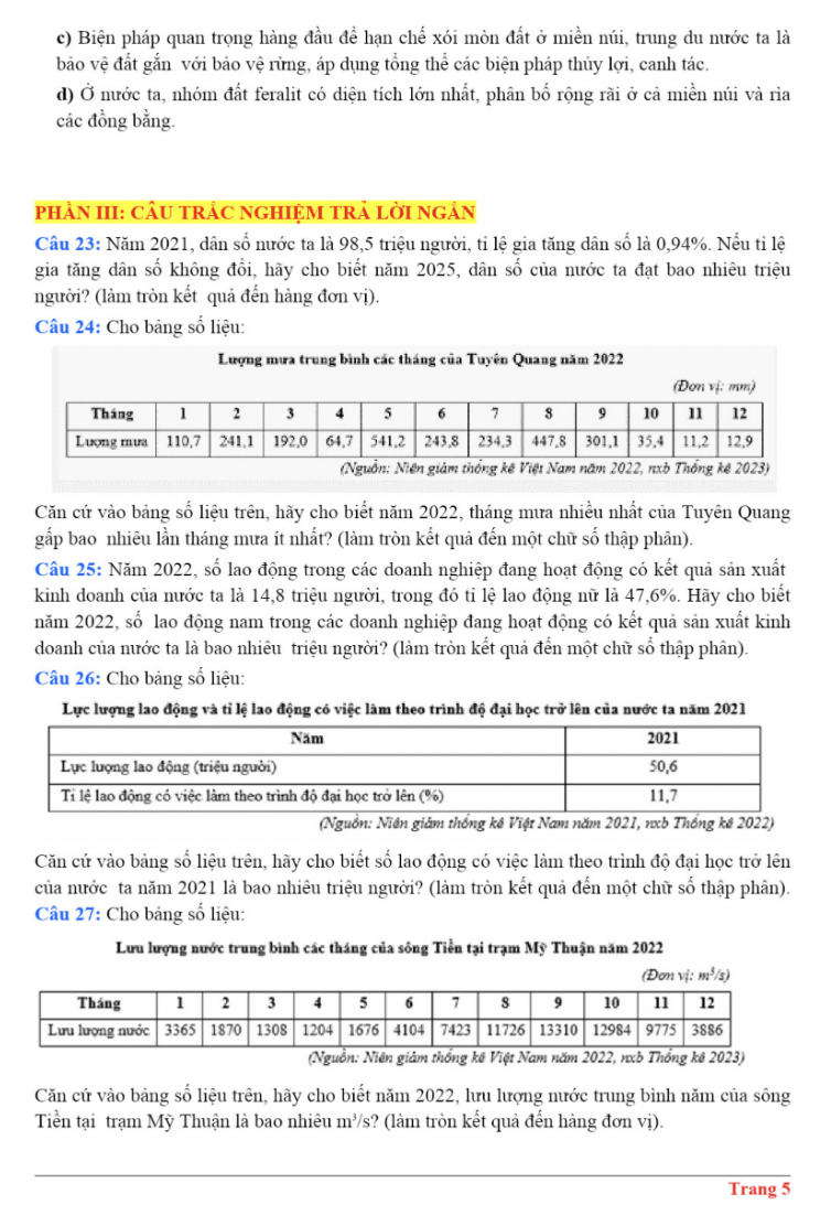 Câu 23: Năm 2021, dân số nước ta là 98,5 triệu người, tỉ lệ gia tăng dân số là 0,94%. Nếu tỉ lệ gia tăng dân số không đổi, hãy cho biết năm 2025, dân số của nước ta đạt bao nhiêu triệu người? (làm tròn kết quả đến hàng đơn vị).
