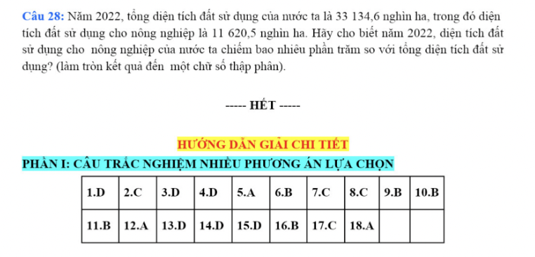 Câu 28: Năm 2022, tổng diện tích đất sử dụng của nước ta là 33 134,6 nghìn ha, trong đó diện tích đất sử dụng cho nông nghiệp là 11 620,5 nghìn ha. Hãy cho biết năm 2022, diện tích đất sử dụng cho nông nghiệp của nước ta chiếm bao nhiêu phần trăm so với tổng diện tích đất sử dụng? (làm tròn kết quả đến một chữ số thập phân).