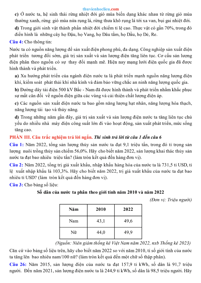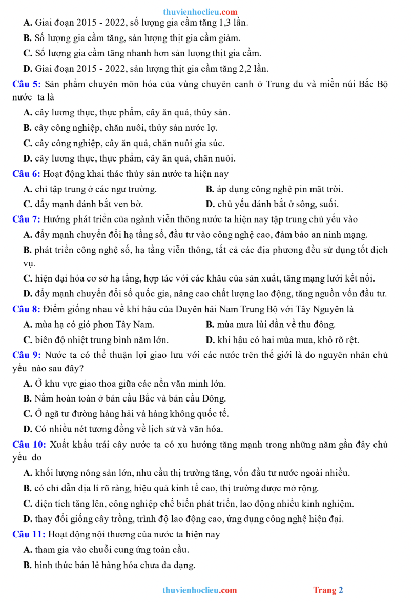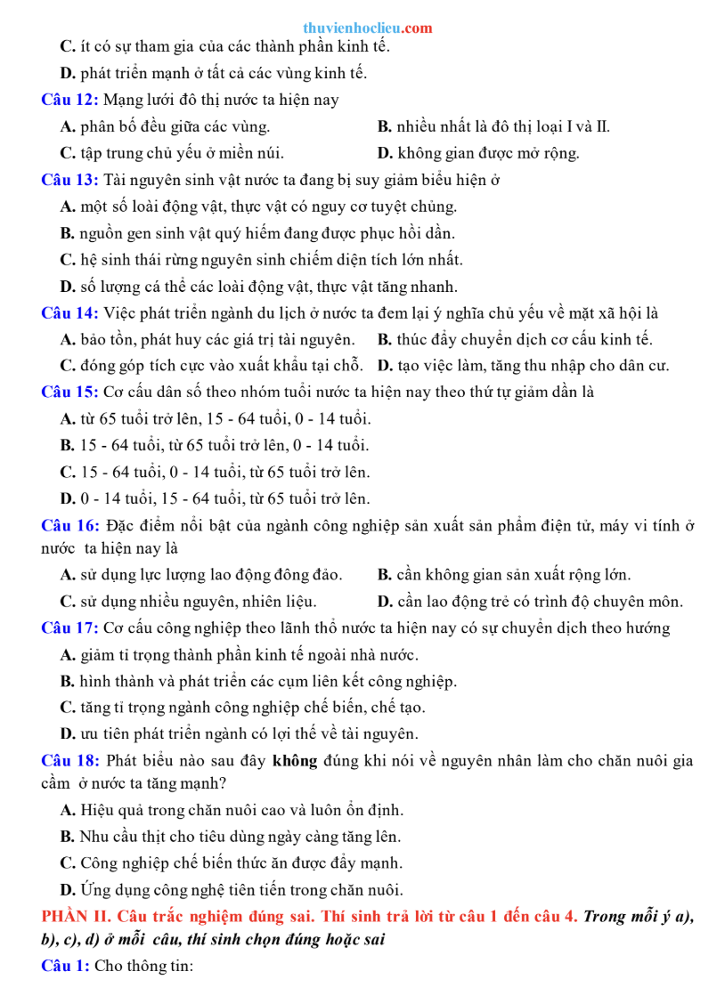 Đề thi bao quát toàn bộ chương trình Địa lí lớp 12, tập trung vào các nội dung như: địa lí tự nhiên, dân cư – xã hội, các ngành kinh tế trọng điểm, cùng với các chuyên đề then chốt như chuyển dịch cơ cấu kinh tế, khai thác thế mạnh theo vùng, phát triển kinh tế bền vững, và hệ thống câu hỏi rèn luyện kỹ năng sử dụng Atlat Địa lí Việt Nam – một phần thiết yếu trong bài thi trắc nghiệm.