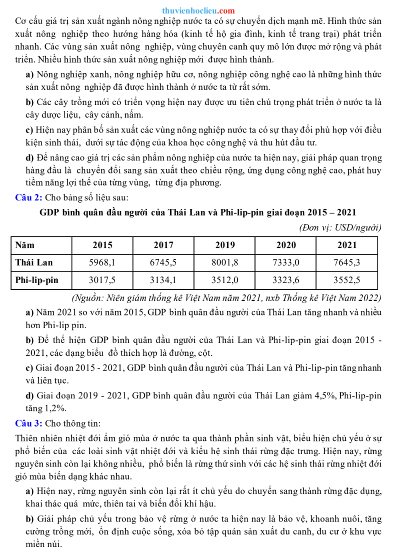 d) Giai đoạn 2019 – 2021, GDP bình quân đầu người của Thái Lan giảm 4,5%, Phi-lip-pin tăng 1,2%.