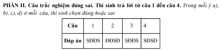 Thí sinh trả lời từ câu 1 đến câu 4. Trong mỗi ý a), b), c), d) ở mỗi câu, thí sinh chọn đúng hoặc sai.