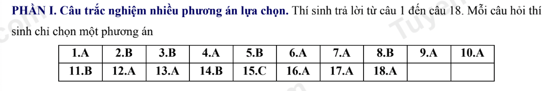 PHẦN I. Câu trắc nghiệm nhiều phương án lựa chọn. Thì sinh trả lời tới câu 1 đến câu 18. Mỗi câu hỏi thì sinh chỉ chọn một phương án.