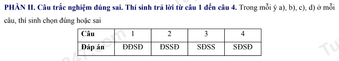 PHẦN II. Câu trắc nghiệm đúng sai. Thí sinh trả lời từ câu 1 đến câu 4. Trong mỗi ý a), b), c), d) ở mỗi câu, thi sinh chọn đúng hoặc sai
