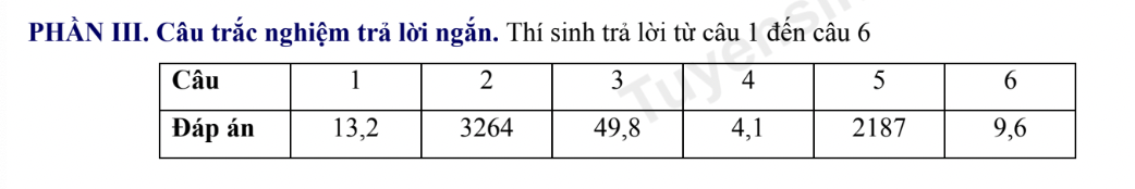 PHẦN III. Câu trắc nghiệm trả lời ngắn. Thí sinh trả lời từ câu 1 đến câu 6