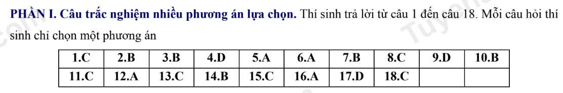 PHẦN I. Câu trắc nghiệm nhiều phương án lựa chọn. Thí sinh trả lời từ câu 1 đến câu 18. Mỗi câu hỏi thí sinh chỉ chọn một phương án