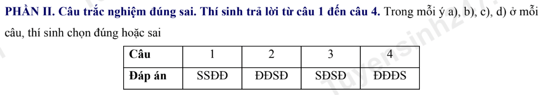 PHẦN II. Câu trắc nghiệm đúng sai. Thí sinh trả lời từ câu 1 đến câu 4. Trong mỗi ý a), b), c), d) ở mỗi câu, thí sinh chọn đúng hoặc sai