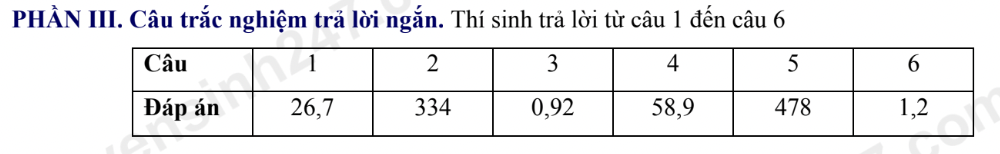 PHẦN III. Câu trắc nghiệm trả lời ngắn. Thí sinh trả lời từ câu 1 đến câu 6