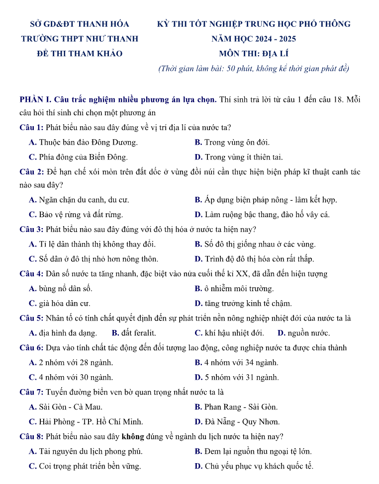 Đề thi thử tốt nghiệp THPT 2025 môn Địa Lí – THPT Như Thanh (Sở Thanh Hóa)