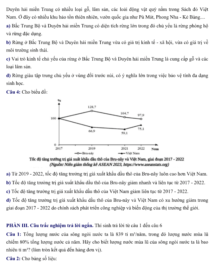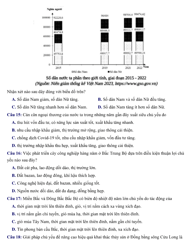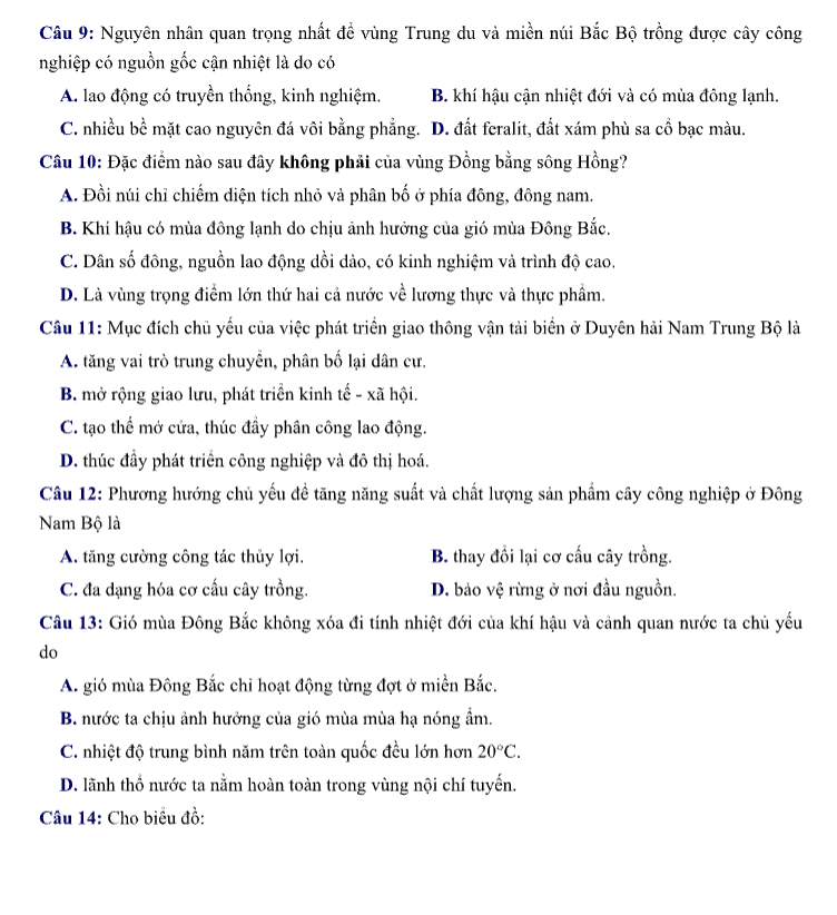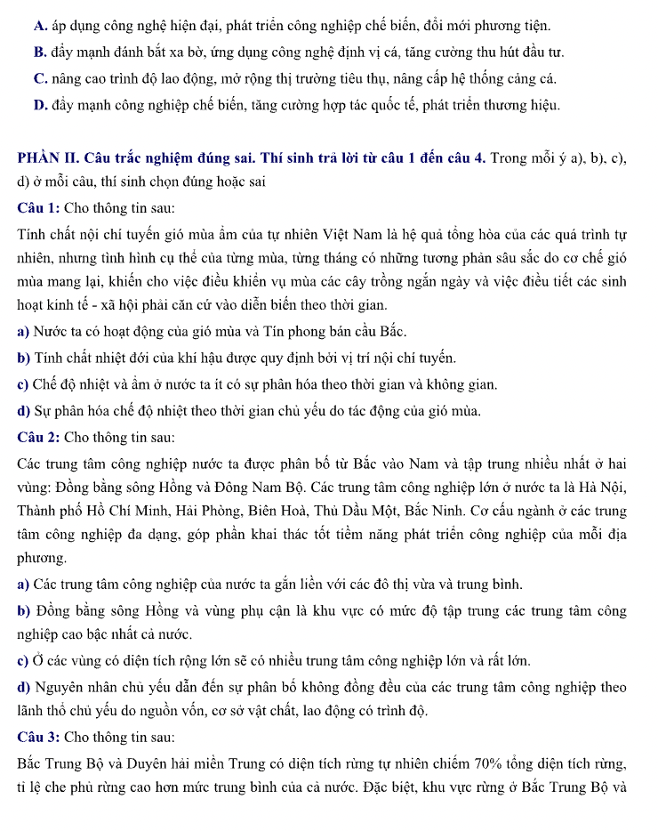 Nội dung đề thi bao phủ toàn diện các phần trọng tâm của chương trình Địa lí lớp 12 như: địa lí tự nhiên, dân cư – xã hội, các ngành kinh tế trọng điểm và vùng lãnh thổ, kết hợp với các chuyên đề then chốt như chuyển dịch cơ cấu kinh tế, phát triển vùng kinh tế theo thế mạnh, và hệ thống câu hỏi rèn luyện kỹ năng sử dụng Atlat Địa lí Việt Nam – một phần không thể thiếu để đạt điểm cao trong đề thi trắc nghiệm chuẩn.