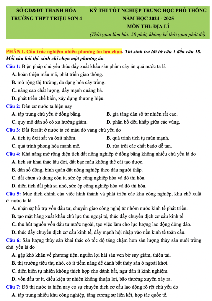 Đề thi thử tốt nghiệp THPT 2025 môn Địa Lí – THPT Triệu Sơn 4 (Sở Thanh Hóa)