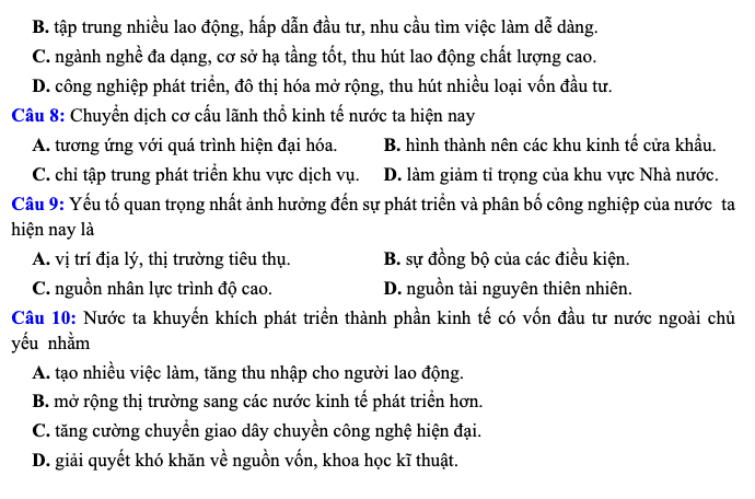 Câu 10: Nước ta khuyến khích phát triển thành phần kinh tế có vốn đầu tư nước ngoài chủ yếu nhằm