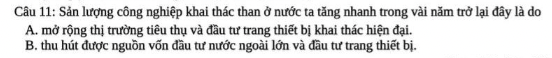 Câu 11: Sản lượng công nghiệp khai thác than ở nước ta tăng nhanh trong vài năm trở lại đây là do