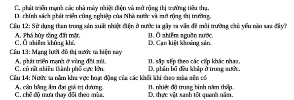 Câu 12: Sử dụng than trong sản xuất nhiệt điện ở nước ta gây ra vấn đề môi trường chủ yếu nào sau đây?
