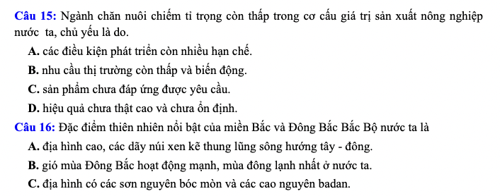 Câu 15: Ngành chăn nuôi chiếm tỉ trọng còn thấp trong cơ cấu giá trị sản xuất nông nghiệp nước ta, chủ yếu là do