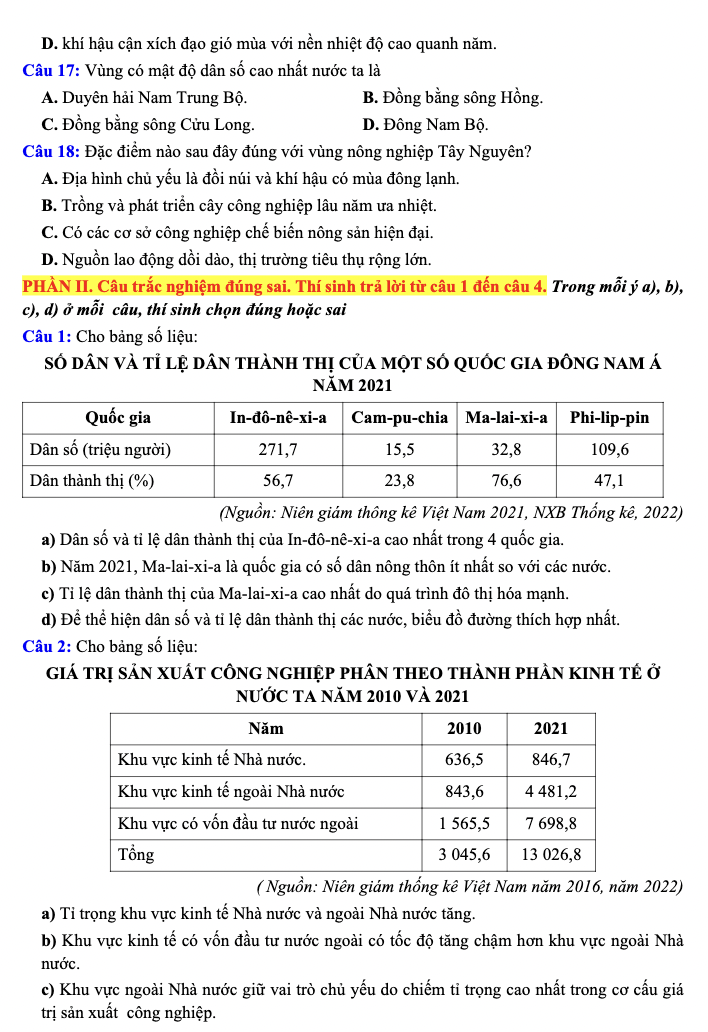 Câu 17: Vùng có mật độ dân số cao nhất nước ta là