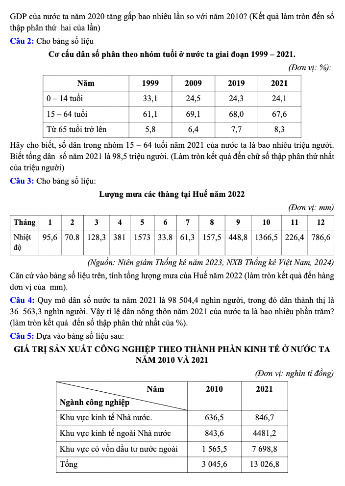 Hãy cho biết, số dân trong nhóm 15–64tuổi năm2021của nước ta là bao nhiêu triệu người. Biết tổng dân số năm2021là98,5triệu người. (Làm tròn kết quả đến chữ số thập phân thứ nhất của triệu người).