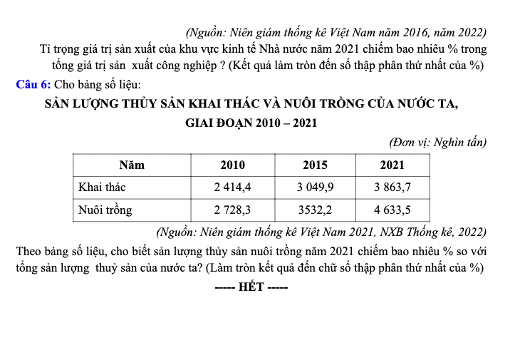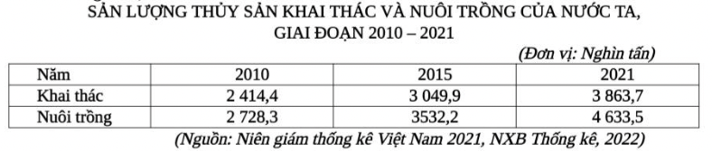 Theo bảng số liệu, cho biết sản lượng thủy sản nuôi trồng năm 2021chiếm bao nhiêu % so với tổng sản lượng thuỷ sản của nước ta? (Làm tròn kết quả đến chữ số thập phân thứ nhất của %).
