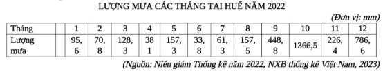 Căn cứ vào bảng số liệu trên, tính tổng lượng mưa của Huế năm 20222022(làm tròn kết quả đến hàng đơn vị của mm).